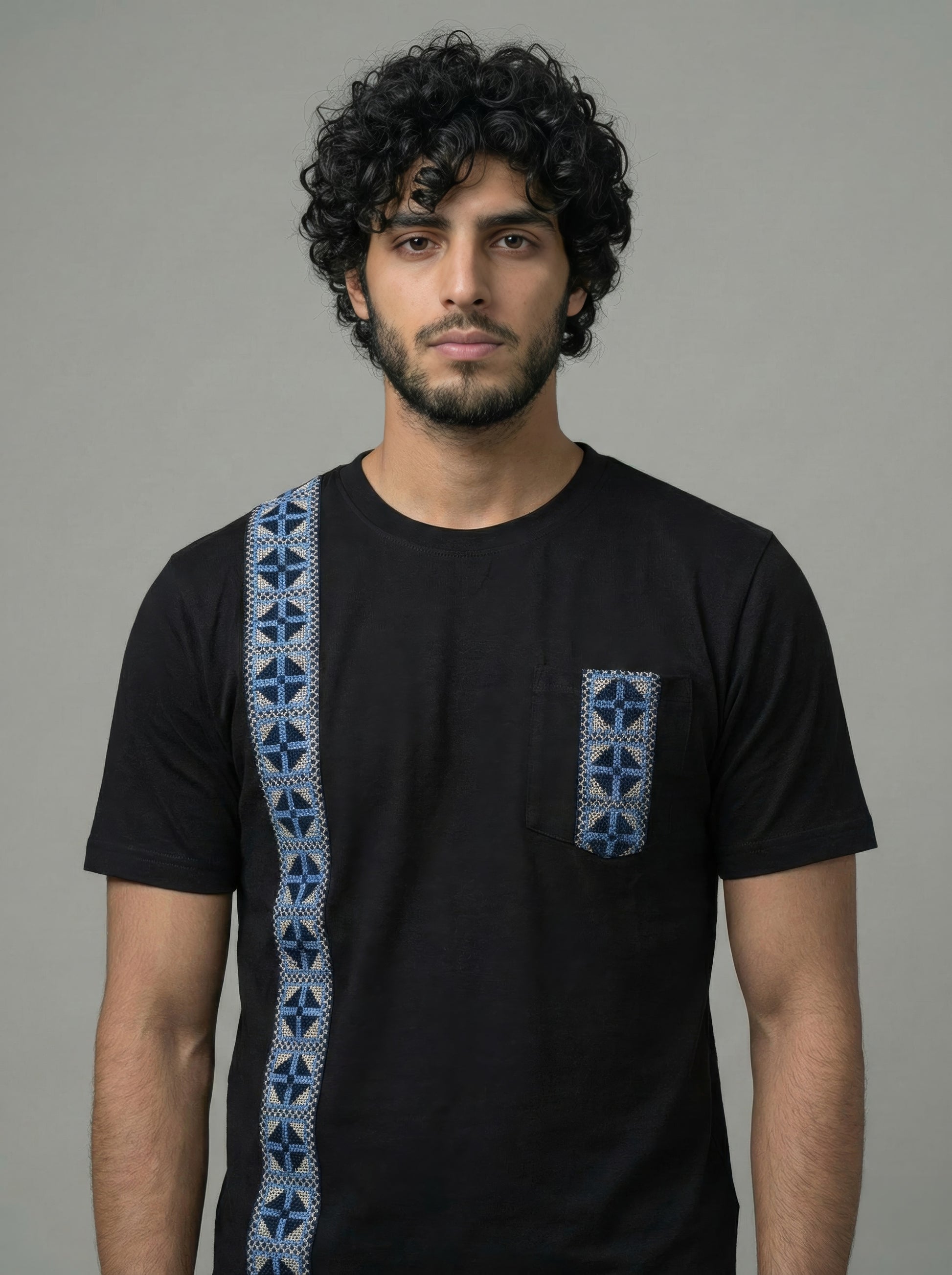 This black T-shirt with cross-stitch detailing turns craft into attitude. A striking vertical cross-stitch panel runs down the front, paired with a matching cross-stitch pocket that pulls the look together. Made from a premium cotton blend, it’s soft, breathable, and holds its shape all day.