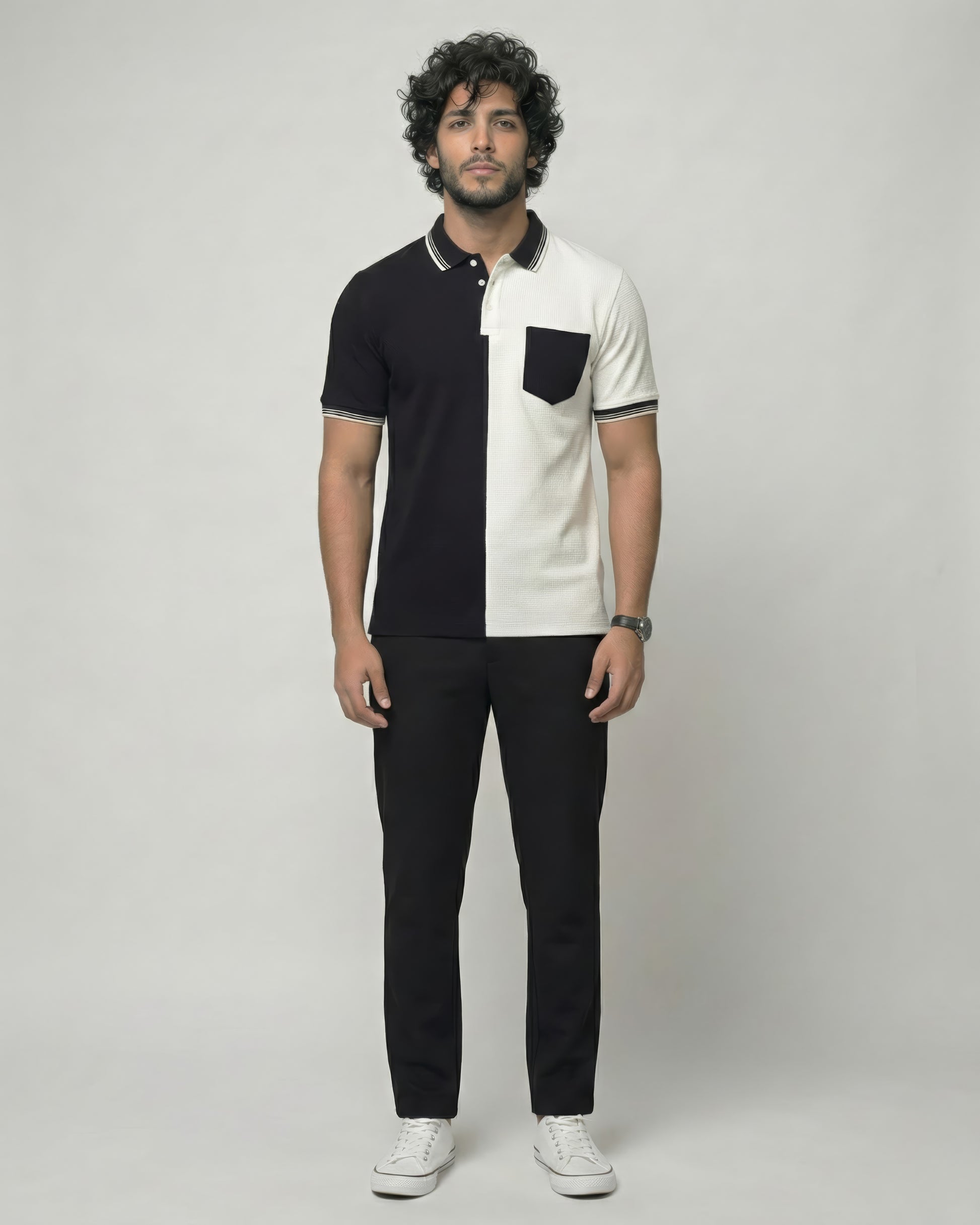 This half-black, half-white contrast polo T-shirt takes the classic polo and draws a clean line through it — literally. A sharp vertical split, contrast pocket, and a structured collar give it an edge that’s impossible to ignore. Made from a premium cotton blend, it’s breathable, soft, and holds its shape through the day.