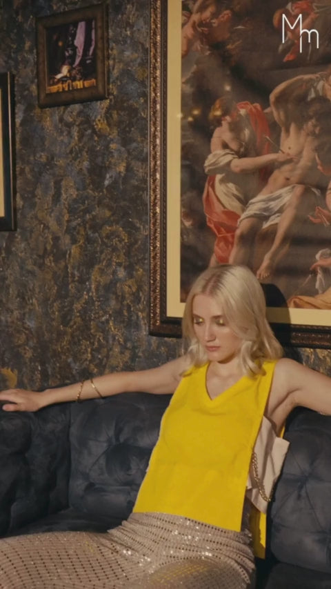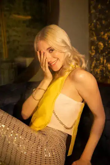he Boxy Fit Top is all about comfort with a statement. Made from 100% organic cotton, it’s breathable, soft, and designed for all-day ease. The dual-tone palette in sunny yellow and beige brings effortless charm, while the chain detail on the sides adds a bold, sophisticated edge.